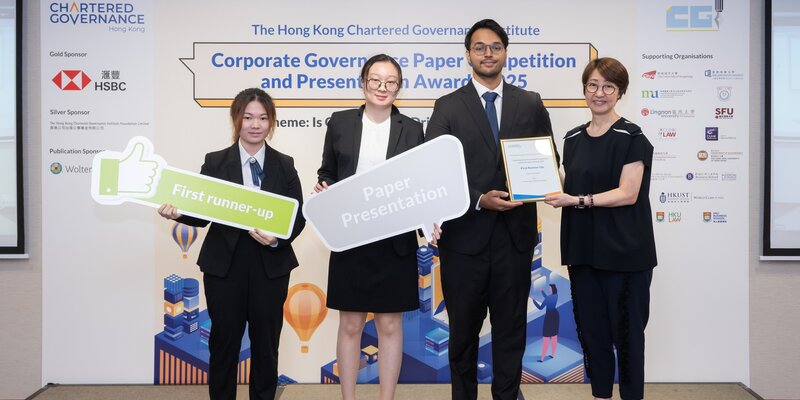 On 6 September 2025, the student team from the Department of Law and Business—comprising Dhillon Fatehkaran Singh, LIN Ruoqi, and WONG Nga-yin—earned notable recognition by securing second runner-up in paper writing and first runner-up in paper presentation at the Corporate Governance Paper Competition and Presentation Awards 2025, organised by the Hong Kong Chartered Governance Institute (HKCGI).