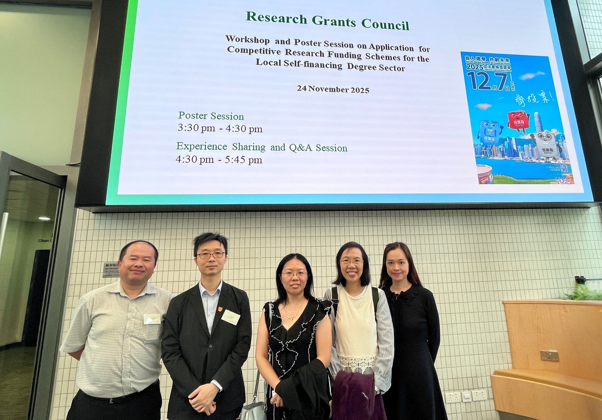研究資助局(研資局)2025年11月24日在香港都會大學舉行「本地自資學位界別競逐研究資助計劃」工作坊暨項目海報展示,匯集逾200名學者。香港樹仁大學協理學術副校長(大學研究)李允安博士、經濟及金融學系副系主任鄧志豪博士、李綺雯教授,以及社會工作學系副教授武婉嫻博士,展示其在教員發展計劃(FDS)研究項目的卓越成果。